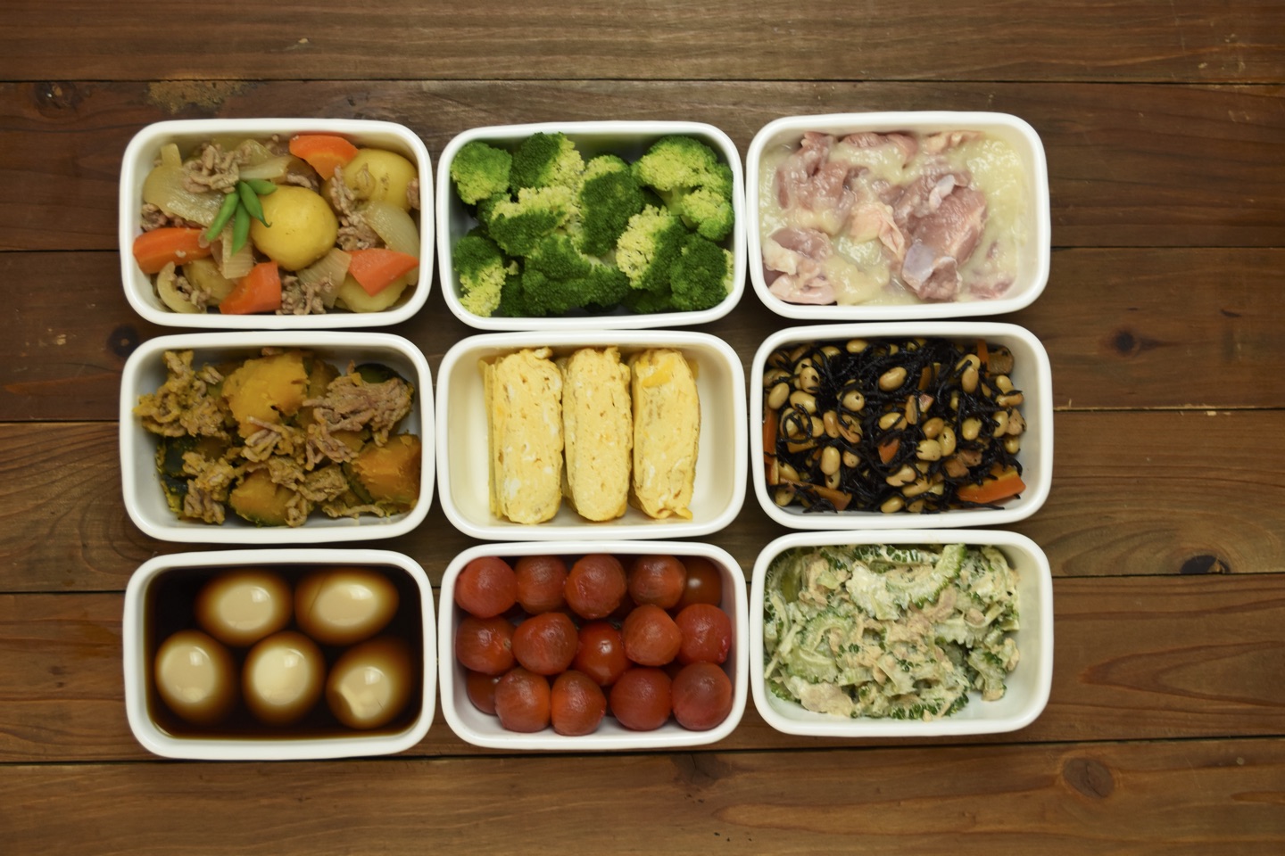 切干大根の煮物、大根とツナ缶の煮物、里芋とイカの煮っころがし、たけのこの土佐煮、卯の花、青菜と厚揚げの煮びたし、きんぴらごぼう、ナスと牛肉の味噌煮、筑前煮、高野豆腐の煮物