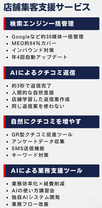 GoogleマップやAI検索の時代、お店が見つからなければ存在しないのと同じです。MEO対策とAIO対策を組み合わせ、検索結果で上位表示されるよう最適化をサポート。お店の情報整理から口コミ活用まで、集客に直結する仕組みをつくります。地域での知名度を高め、来店動機を増やすことで売上アップを実現します。