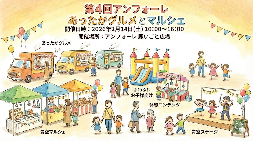 第4回アンフォーレあったかグルメとマルシェ 2026 1/21 お知らせ 詳しくはこちら お知らせ よかったらシェアしてね! URLをコピーしました! 関連記事 【出店募集情報】全日本ぎょうざ祭りin静岡 餃子ブース出店者募集中! 岐阜ファミリーパーク キッチンカー出店情報 名古屋キャンピングカーフェア 2025 AUTUMN DANCE HALL 復活祭 9/13 マルハニチロ株式会社協賛 親子で楽しむ「未来の養殖を考えるお魚料理室」~海水温の上昇による影響とサステナブルシーフードを知ろう~ 2025年5月31日(土曜日)二年ぶりの開催決定 | 名港水上芸術花火2025 4/26-5/6 全日本うまいもの祭り in モリコロパーク ファーマインド協賛 親子で楽しむパイナップル講座